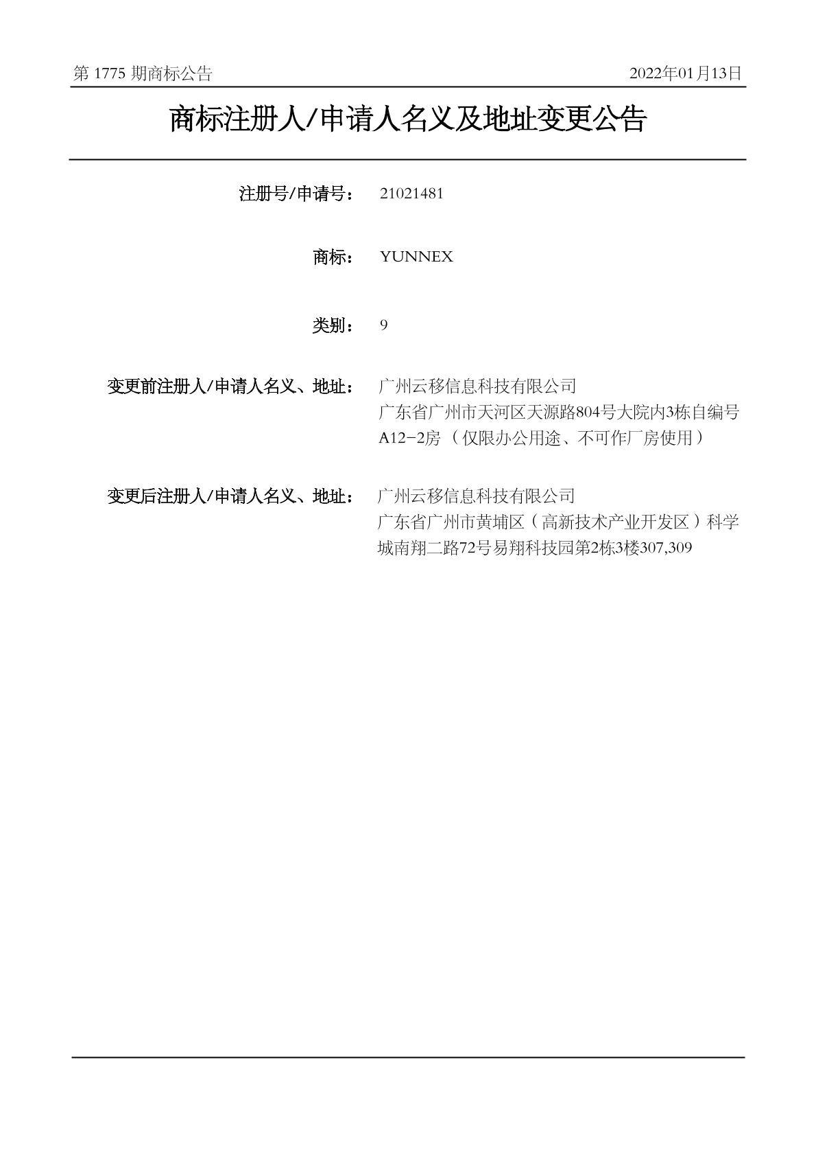 2022-01-14 变更商标申请人/注册人名义/地址 | 核准证明打印发送