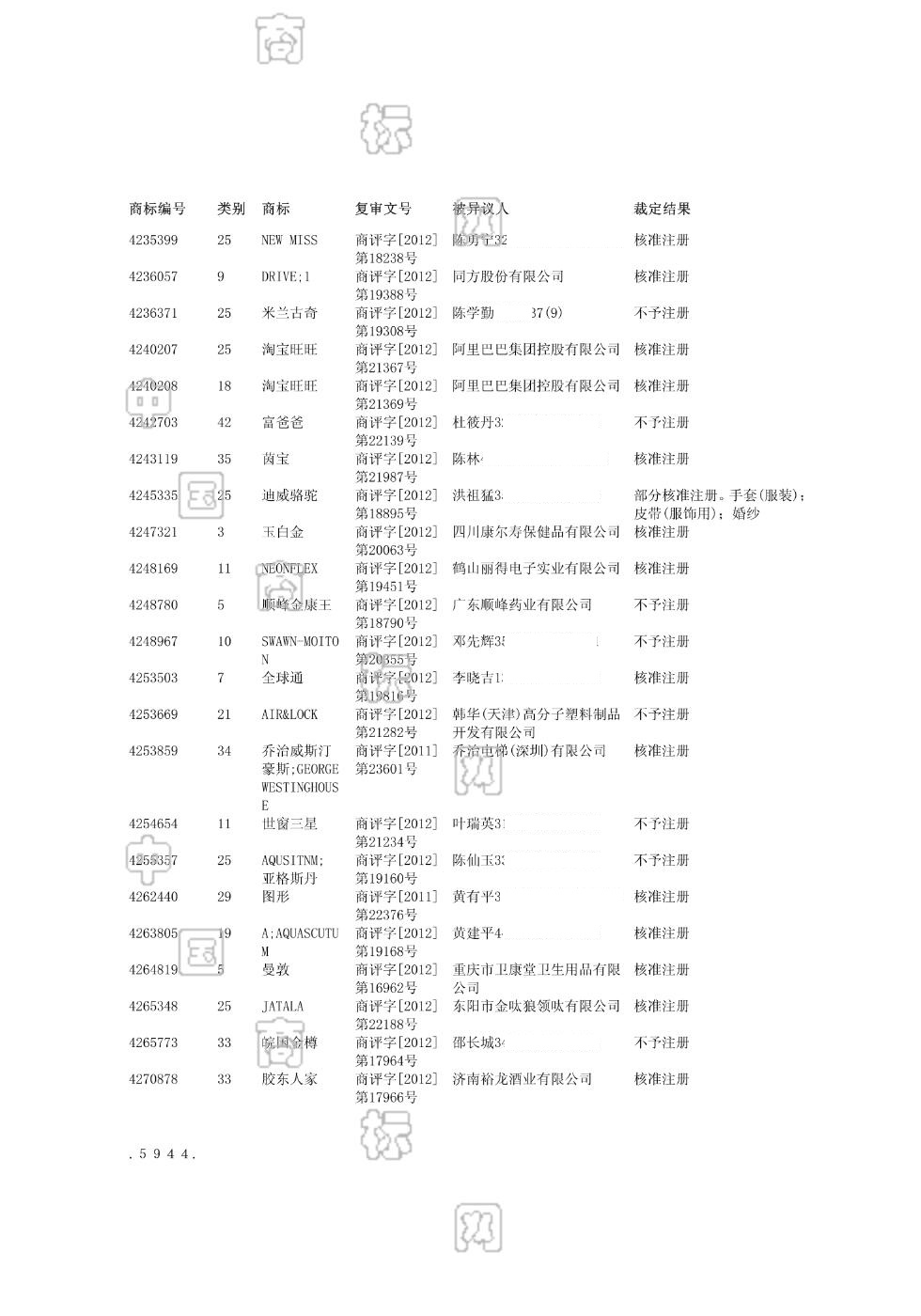 商标异议复审裁定公告 2012-10-27 第1333期 查看公告