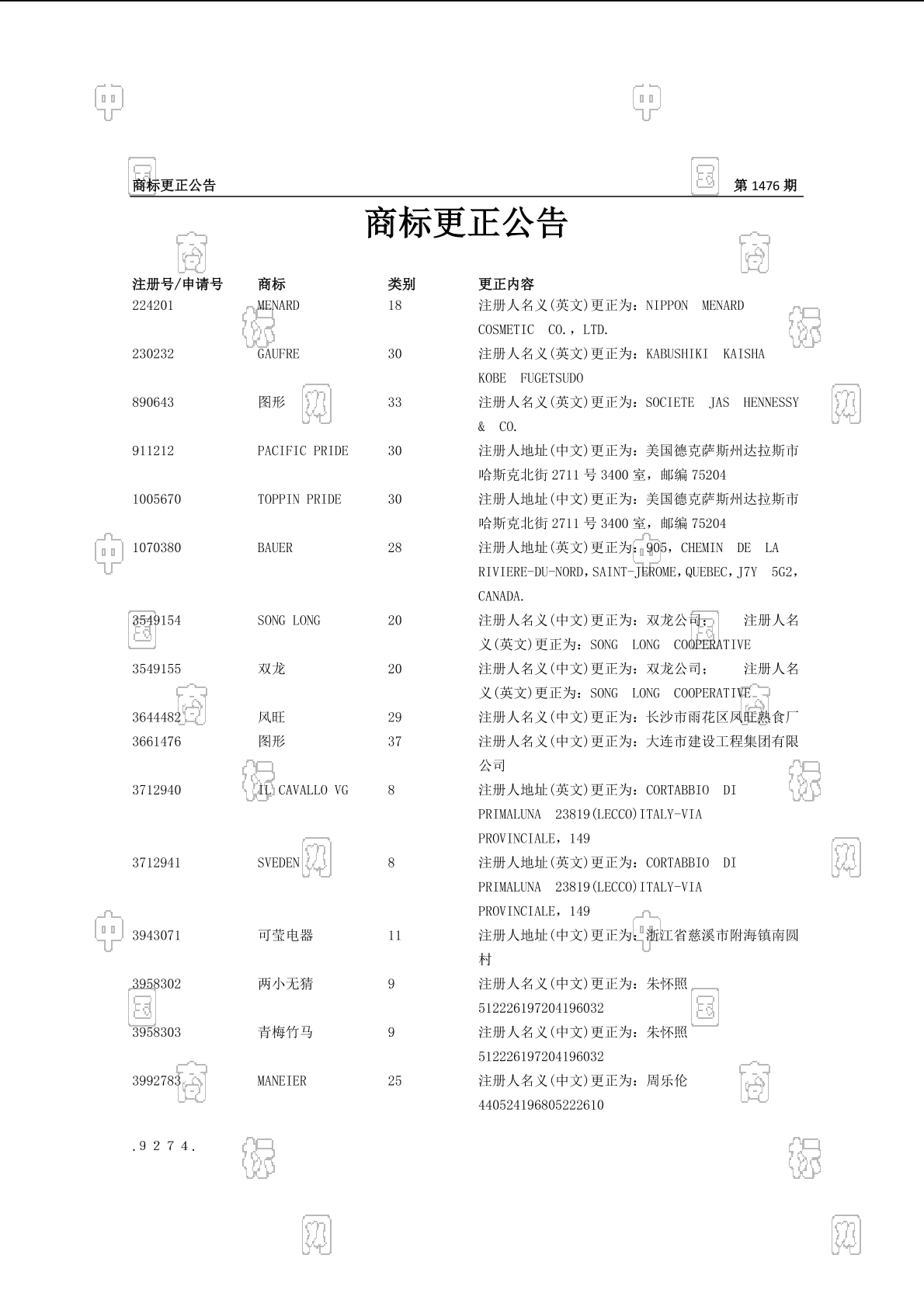 2016-05-25 更正商标申请/注册事项 | 核准通知发文