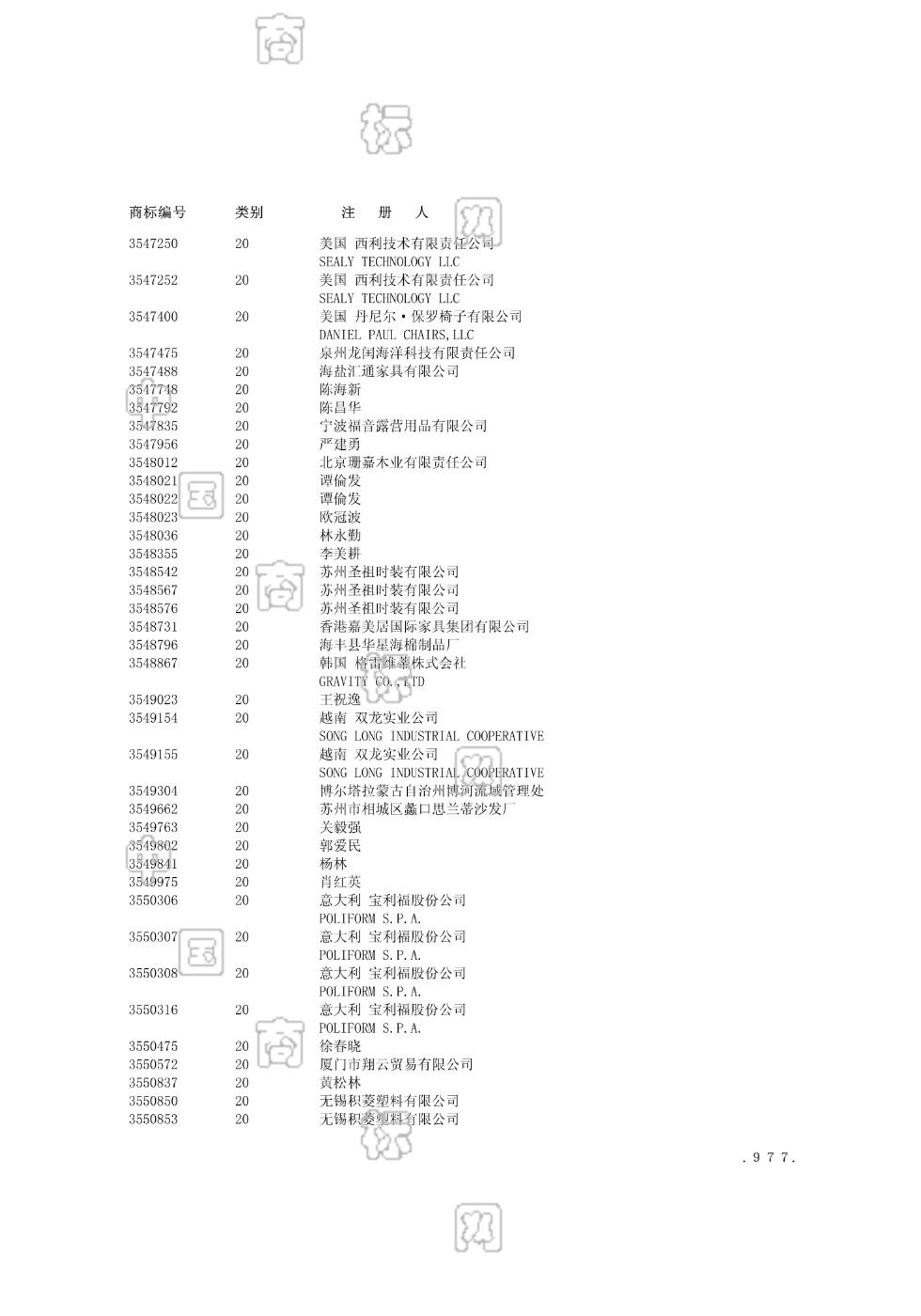 2001-凳子(家具);2001-挂衣架;2001-桌子;2001-椅子(座椅);2001-贮存架;2002-塑料包装容器;2002-非金属容器(存储和运输用);2002-非金属液态燃料容器;2012-非金属挂衣钩;2012-非金属的衣服挂钩 - 951