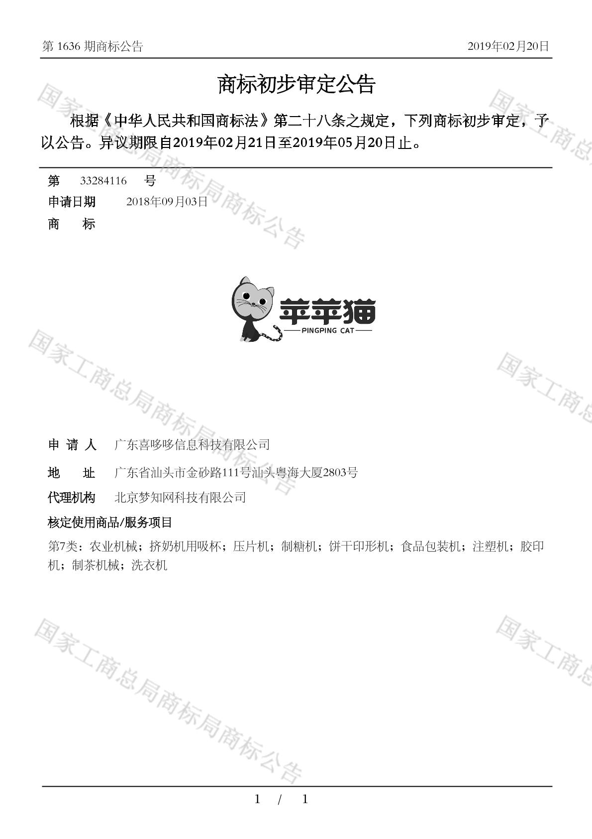 【苹苹猫 PINGPINGCAT】商标详情