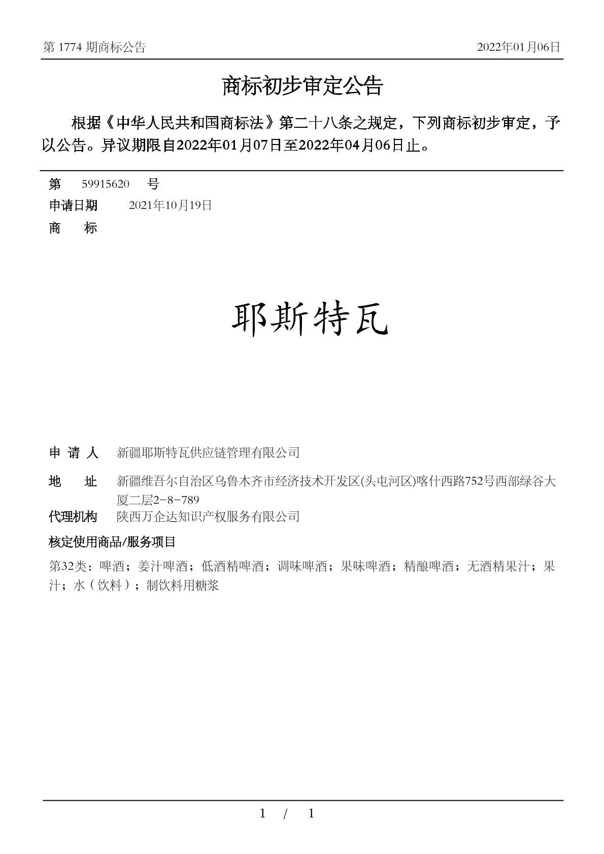 3201-低酒精啤酒;3201-啤酒;3201-姜汁啤酒;3201-果味啤酒;3201-精酿啤酒;3201-调味啤酒;3202-无酒精果汁;3202-果汁;3202-水(饮料);3203-制饮料用糖浆 - 1774