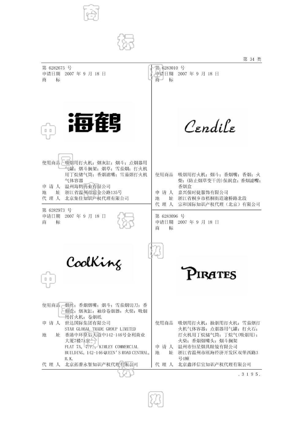 3401-烟草;3401-雪茄烟;3402-烟斗;3402-烟斗搁架;3402-烟灰缸;3404-吸烟用打火机;3404-打火机用丁烷储气筒;3404-点烟器用气罐;3404-雪茄烟打火机气体容器;3405-香烟滤嘴 - 1174