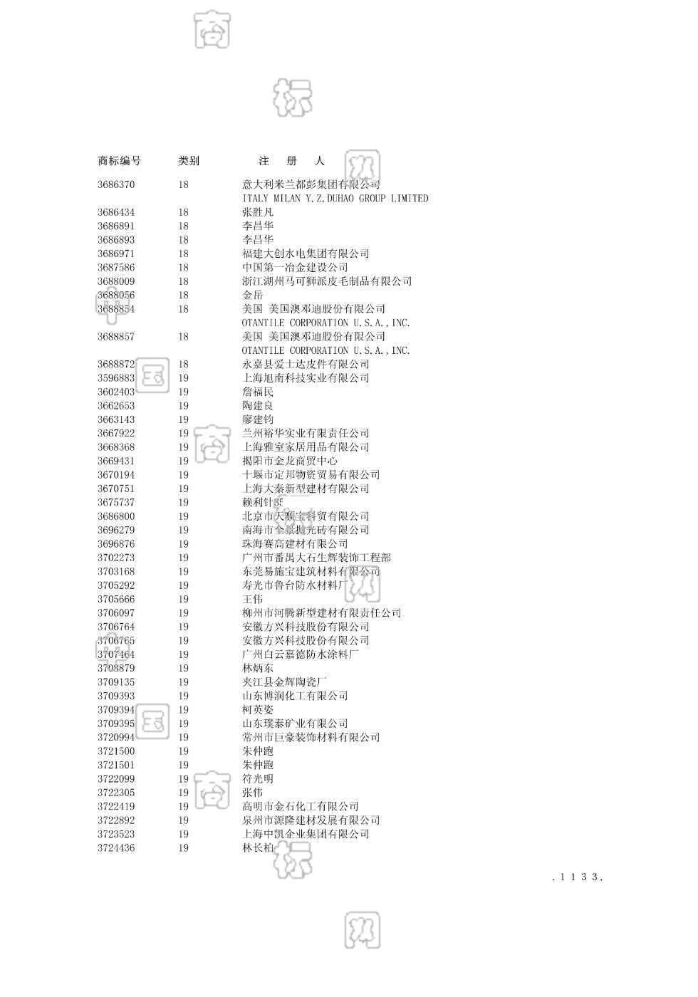 1902-人造石;1902-石英;1906-水磨石;1907-耐火材料;1909-非金属建筑材料;1909-非金属门;1910-非金属建筑物;1912-涂层(建筑材料);1913-石料粘合剂;1914-石头、混凝土或大理石艺术品 - 1001