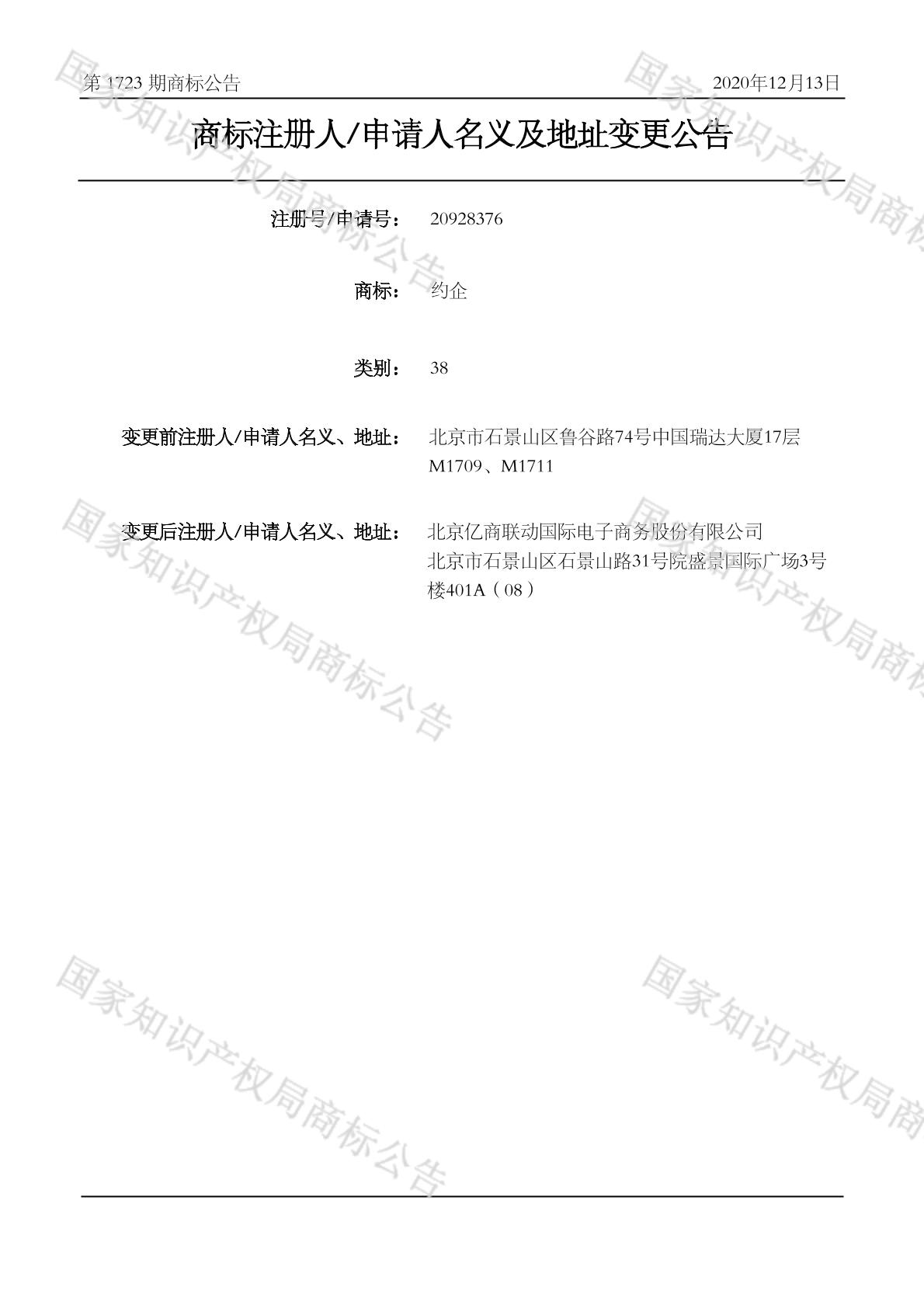 2020-12-05 变更商标申请人/注册人名义/地址 | 核准证明打印发送