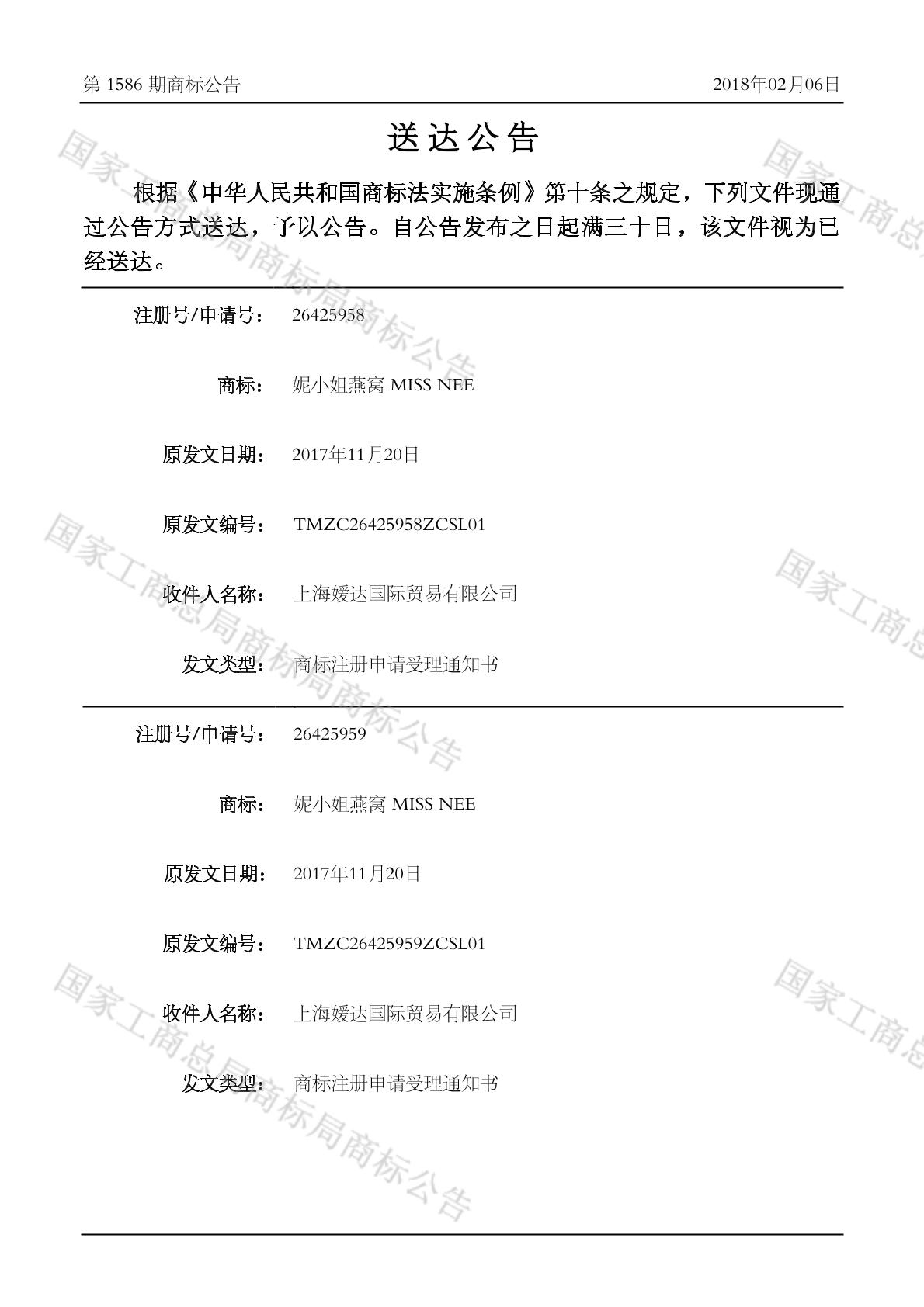 2018-02-06 商标注册申请 | 排版送达公告(商标注册申请受理通知书)