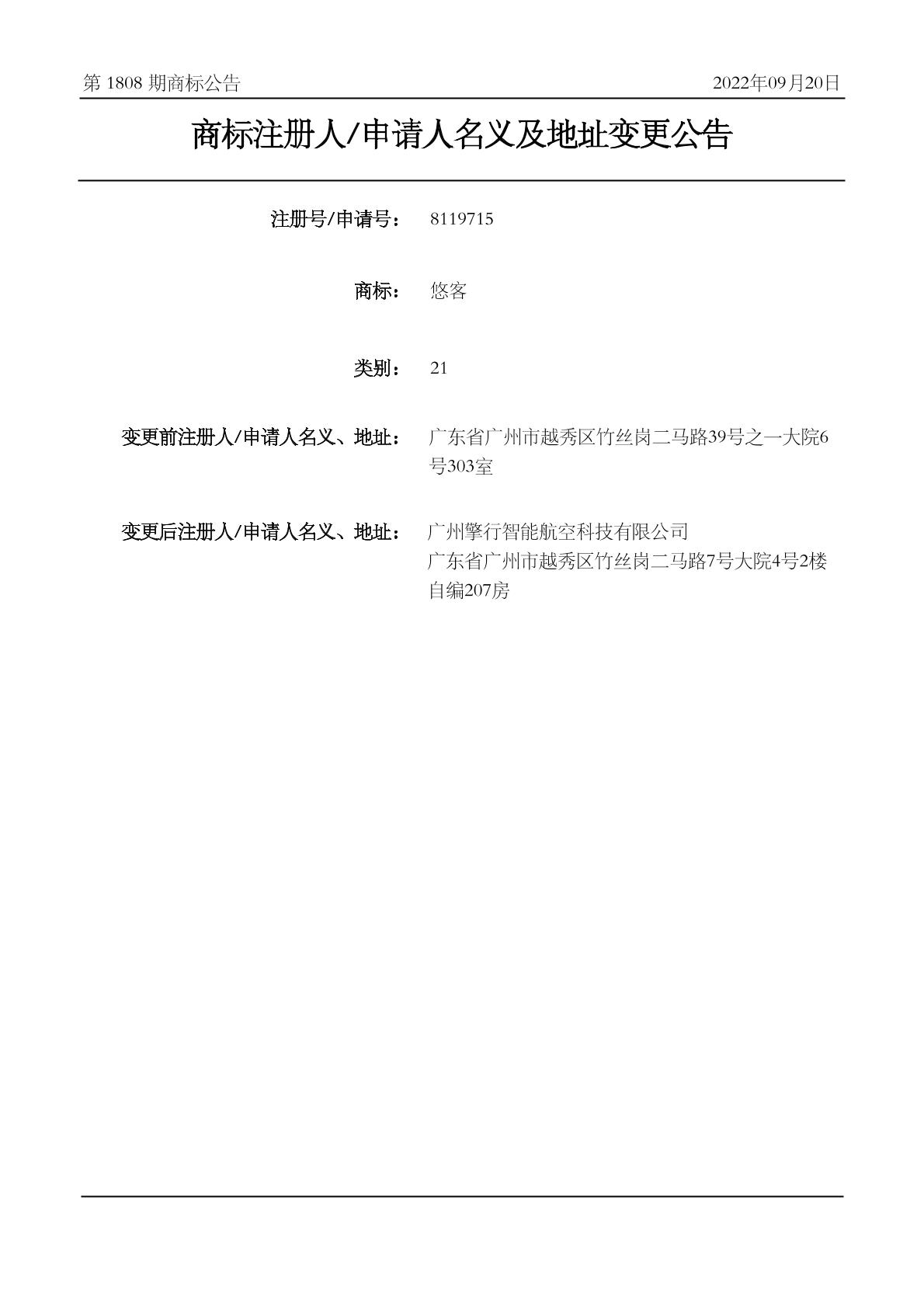 2022-09-20 变更商标申请人/注册人名义/地址 | 核准证明打印发送