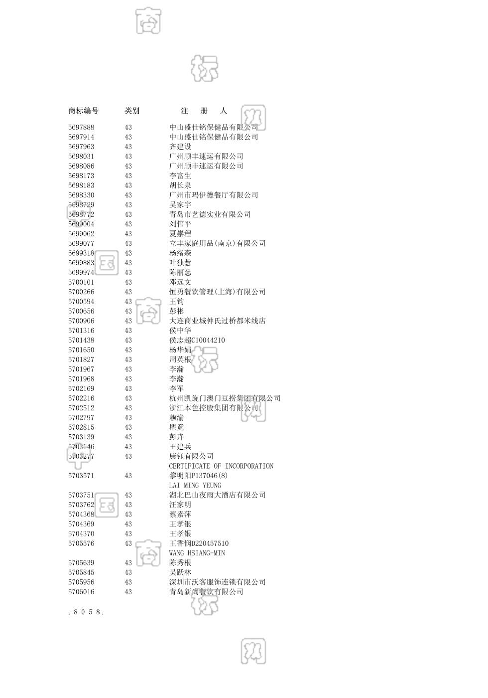 4301-住所(旅馆、供膳寄宿处);4301-咖啡馆;4301-备办宴席;4301-旅馆预订;4301-茶馆;4301-酒吧;4301-饭店;4301-鸡尾酒会服务;4302-会议室出租;4303-养老院 - 1197